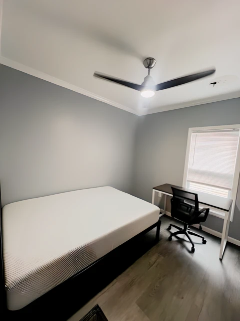 침대, 컴퓨터 테이블 및 의자가 구비된 넓은 침실과 개인 잠금장치/열쇠.